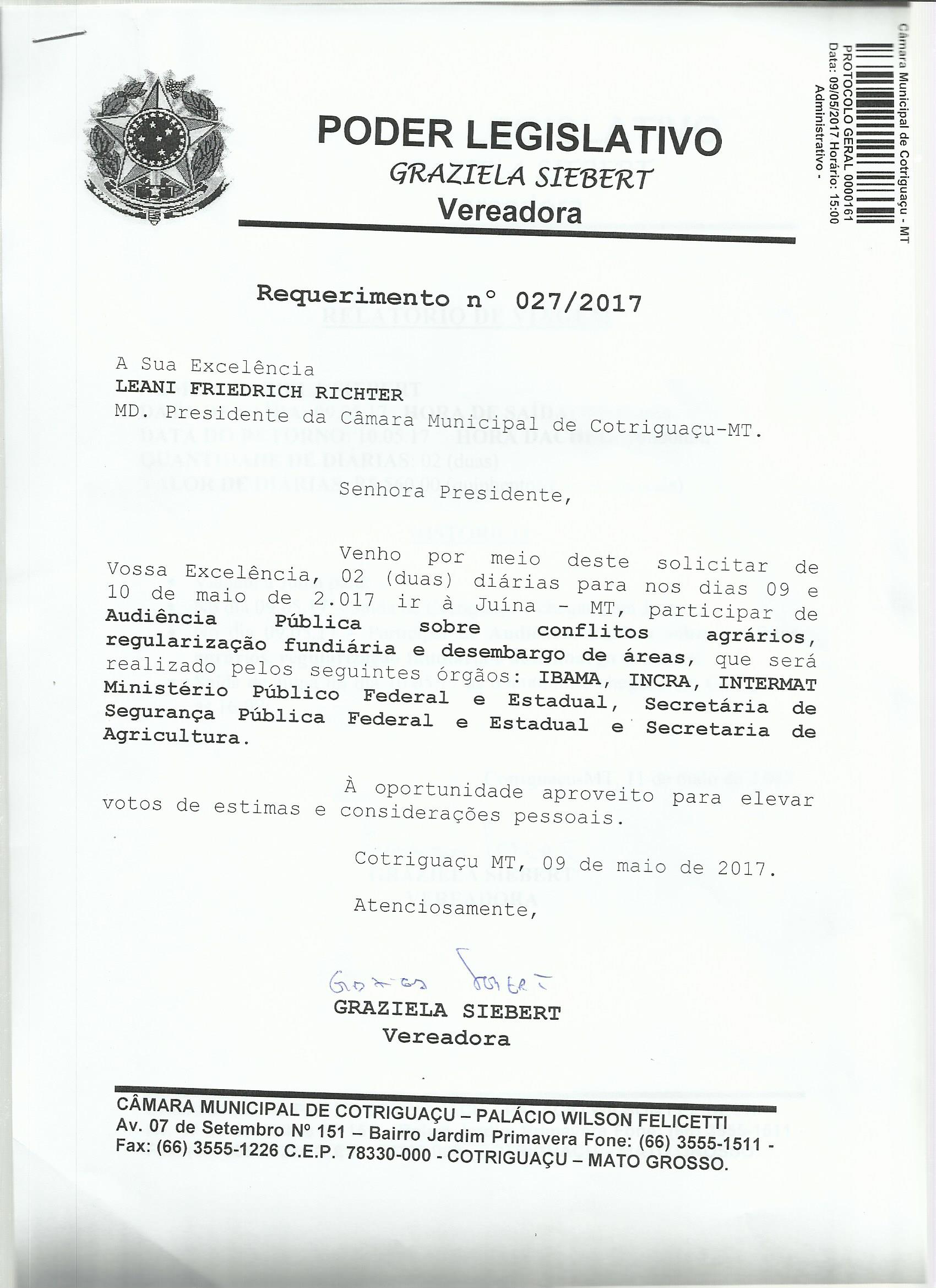 Assunto: VENHO POR MEIO DESTE SOLICITAR DE VOSSA EXCELÊNCIA, 02 (DUAS) DIÁRIAS PARA NOS DIAS 09 E 10 DE MAIO DE 2.017 IR À JUÍNA - MT, PARTICIPAR DE AUDIÊNCIA PÚBLICA SOBRE CONFLITOS AGRÁRIOS, REGULARIZAÇÃO FUNDIÁRIA E DESEMBARGO DE ÁREAS, QUE SERÁ REALIZADO PELOS SEGUINTES ÓRGÃOS: IBAMA, INCRA, INTERMAT MINISTÉRIO PÚBLICO FEDERAL E ESTADUAL, SECRETÁRIA DE SEGURANÇA PÚBLICA FEDERAL E ESTADUAL E SECRETARIA DE AGRICULTURA.