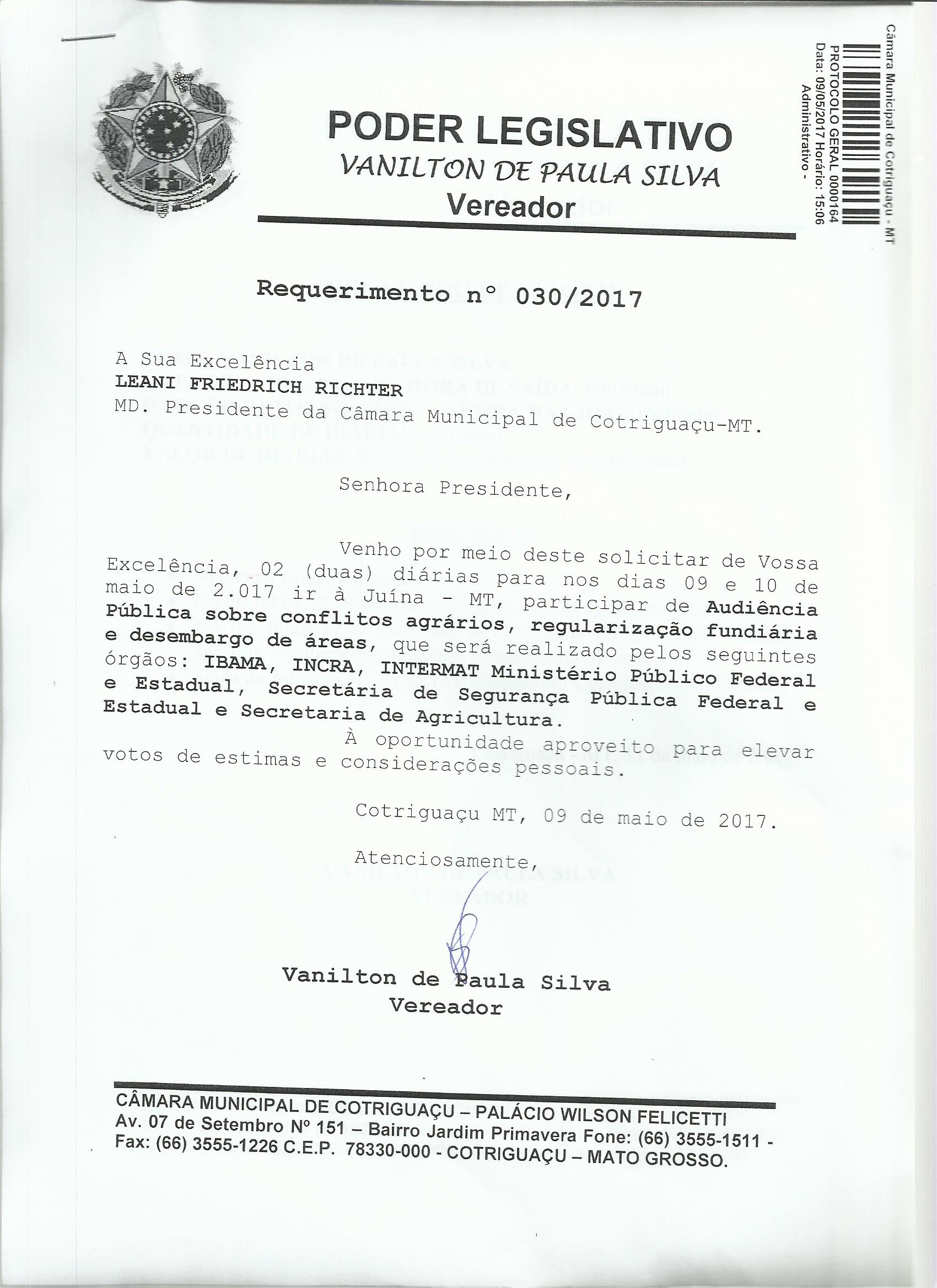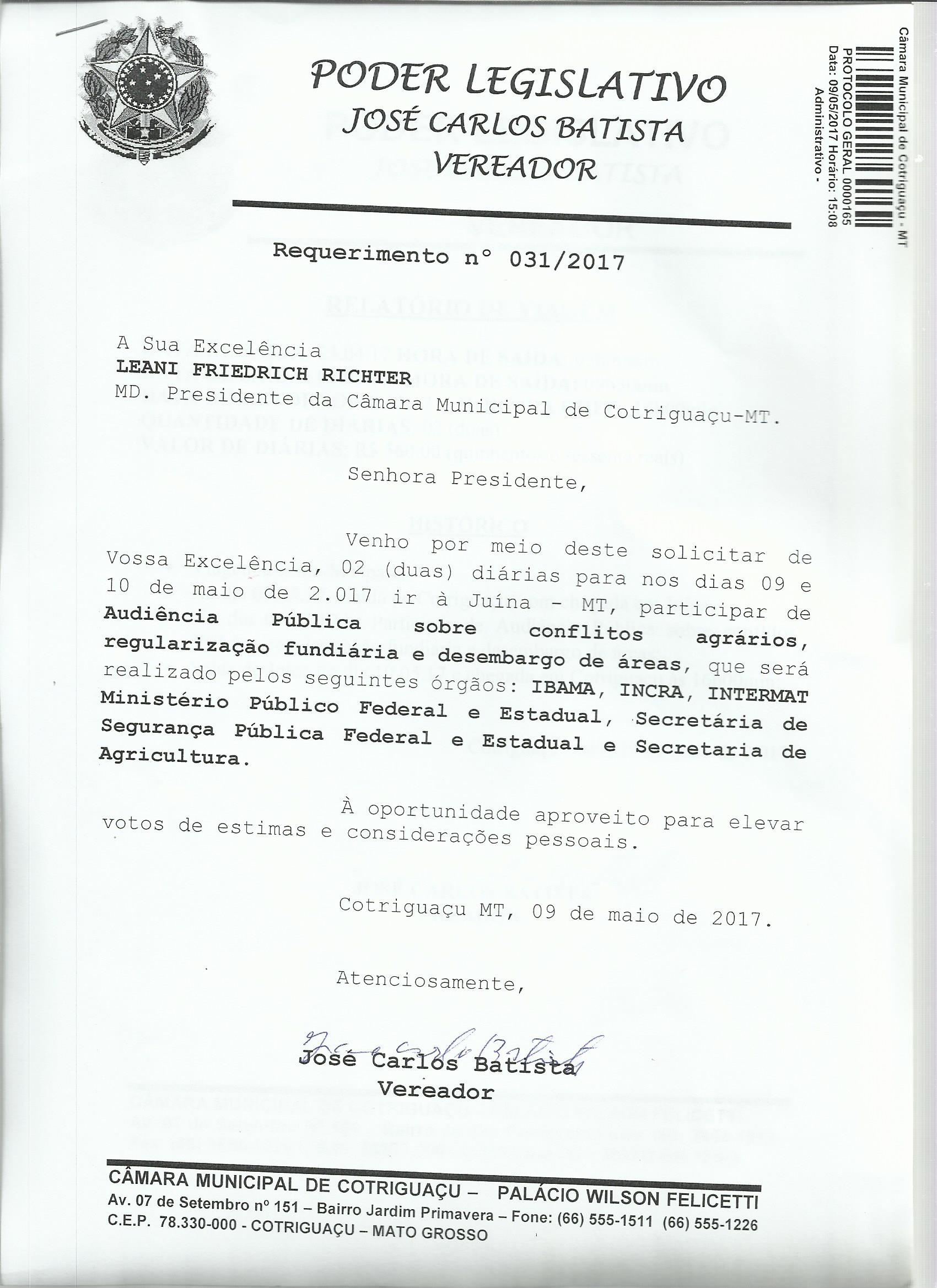 Assunto: VENHO POR MEIO DESTE SOLICITAR DE VOSSA EXCELÊNCIA, 03 (TRÊS) DIÁRIAS PARA NOS DIAS 02 A 04 DE JUNHO DE 2.017 IR À SINOP - MT, PARTICIPAR DE AUDIÊNCIA PÚBLICA, COM OBJETIVO DE DEBATER OS EMBARGOS AMBIENTAIS DOS ASSENTAMENTOS RURAIS DO ESTADO DE MATO GROSSO.