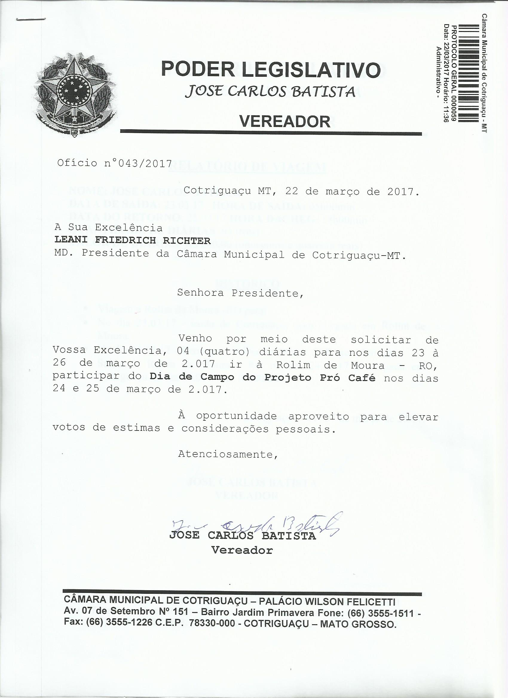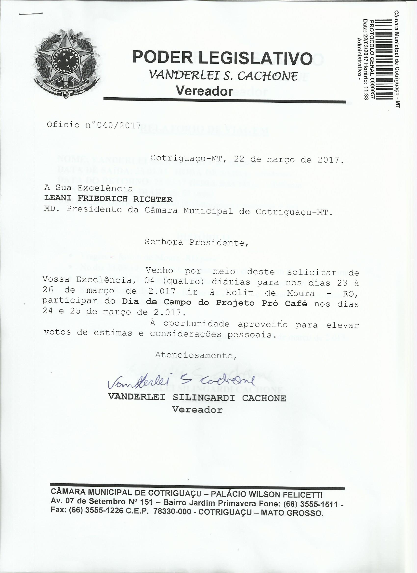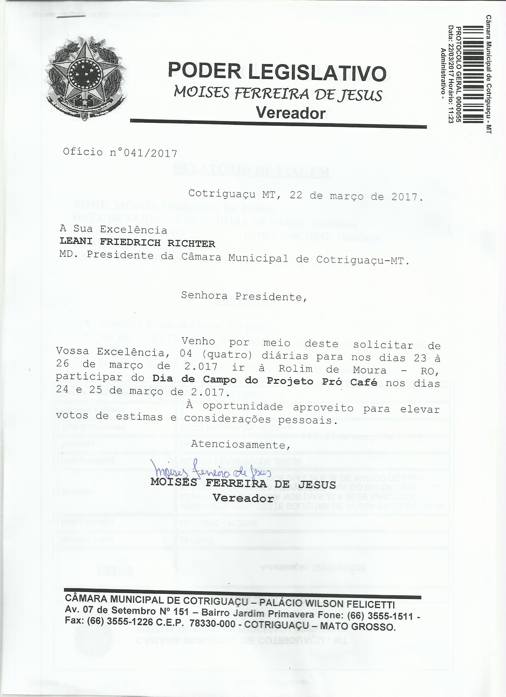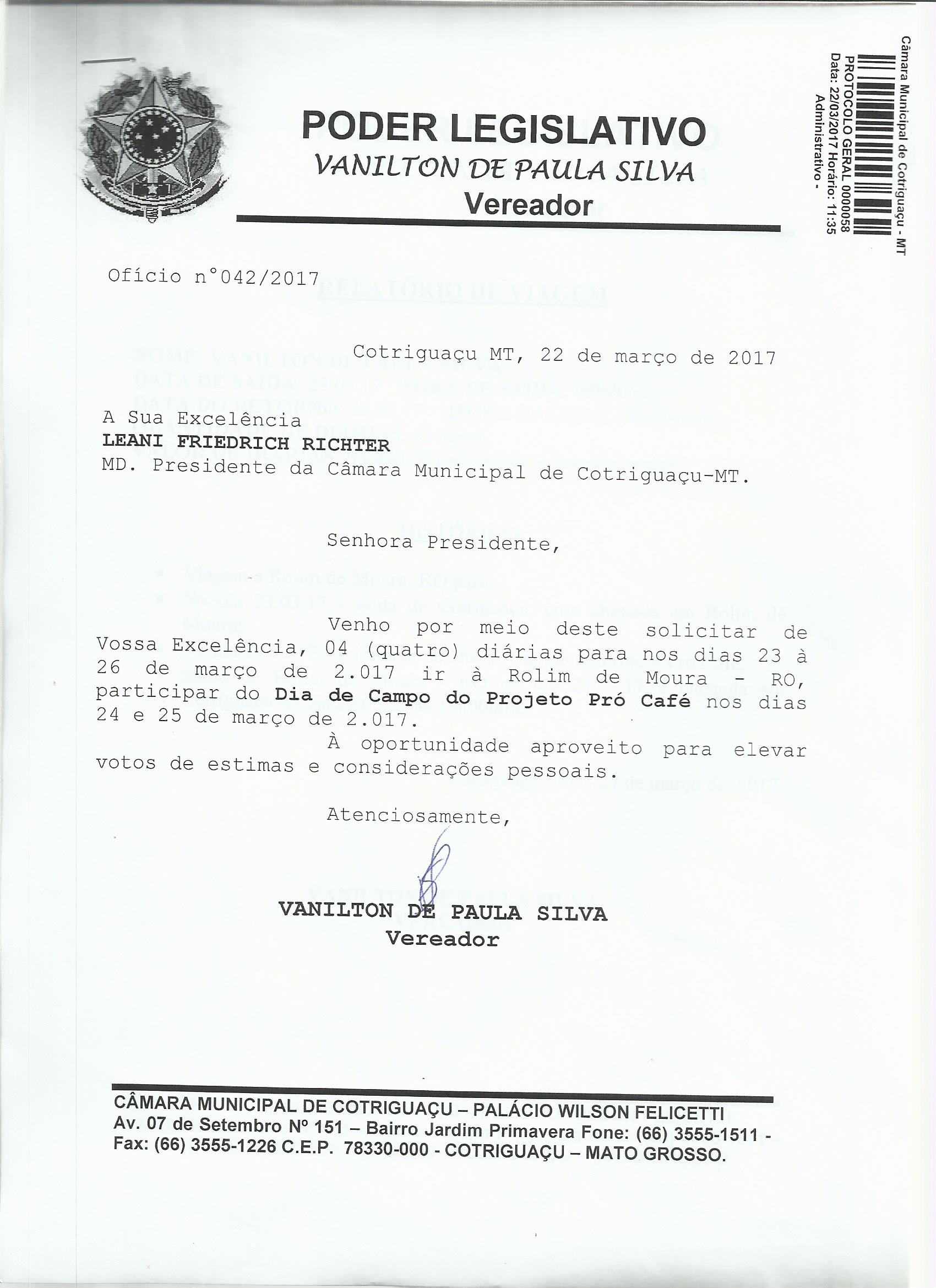 Assunto: VENHO POR MEIO DESTE SOLICITAR DE VOSSA EXCELÊNCIA, 04 (QUATRO) DIÁRIAS PARA NOS DIAS 23 À 26 DE MARÇO DE 2.017 IR À ROLIM DE MOURA - RO, PARTICIPAR DO DIA DE CAMPO DO PROJETO PRÓ CAFÉ NOS DIAS 24 E 25 DE MARÇO DE 2.017.