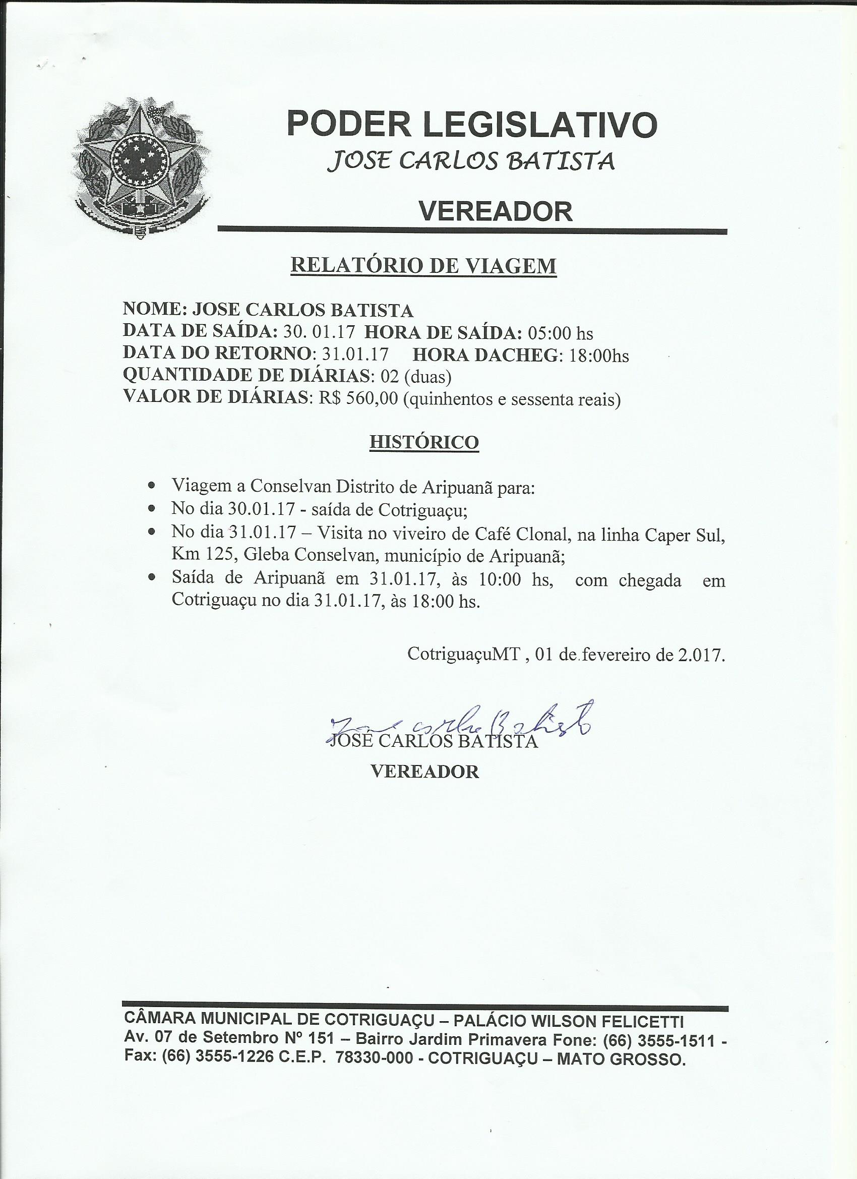 Assunto: DUAS DIÁRIAS AO VEREADOR JOSE CARLOS BATISTA A CONSELVAN DISTRITO DE ARIPUANÃ, PARA FAZER VISITA AO VIVEIRO DE CAFÉ CLONAL