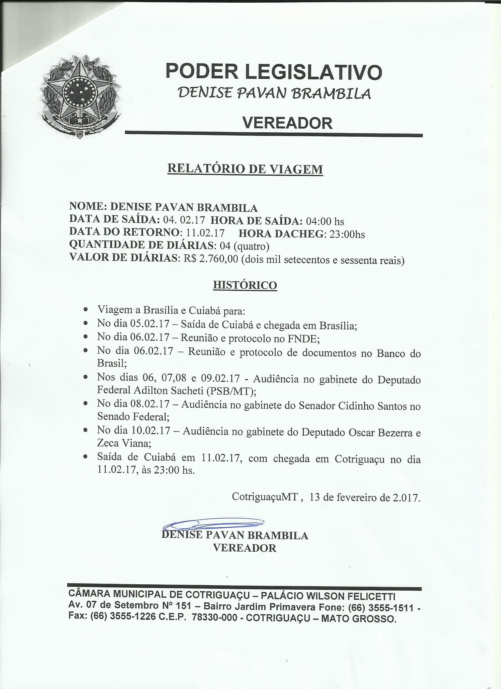 Assunto: QUATRO DIÁRIAS A BRASILIA A VEREADORA DENISE PAVAN BRAMBILA PARA REUNIÃO E PROTOCOLO DE DOCUMENTOS NO FNDE, BANCO DO BRASIL, AUDIÊNCIA COM DEPUTADO FEDERAL ADILTON SACHETI, SENADOR CIDINHO SANTOS E DEPUTADOS OSCAR BEZERRA E ZECA VIANA