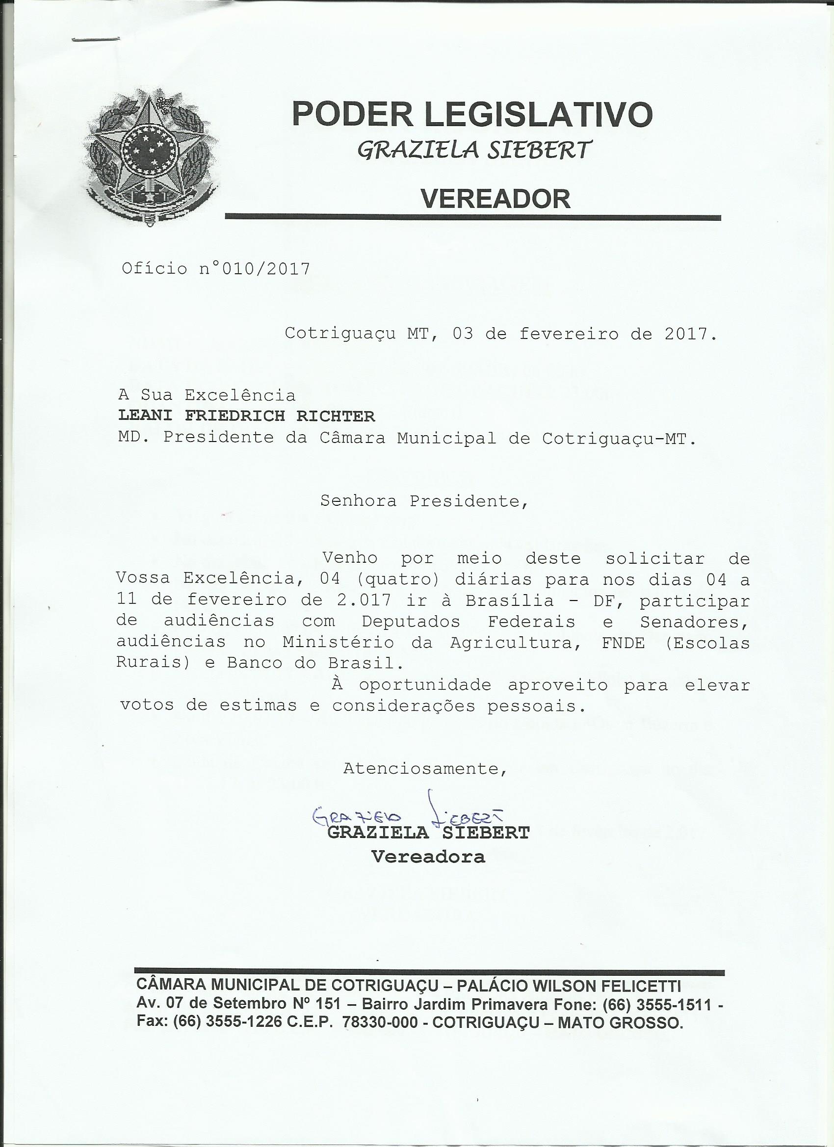 Assunto: QUATRO DIÁRIAS A BRASILIA A VEREADORA GRAZIELA SIEBERT PARA REUNIÃO E PROTOCOLO DE DOCUMENTOS NO FNDE, BANCO DO BRASIL, AUDIÊNCIA COM DEPUTADO FEDERAL ADILTON SACHETI, SENADOR CIDINHO SANTOS E DEPUTADOS OSCAR BEZERRA E ZECA VIANA