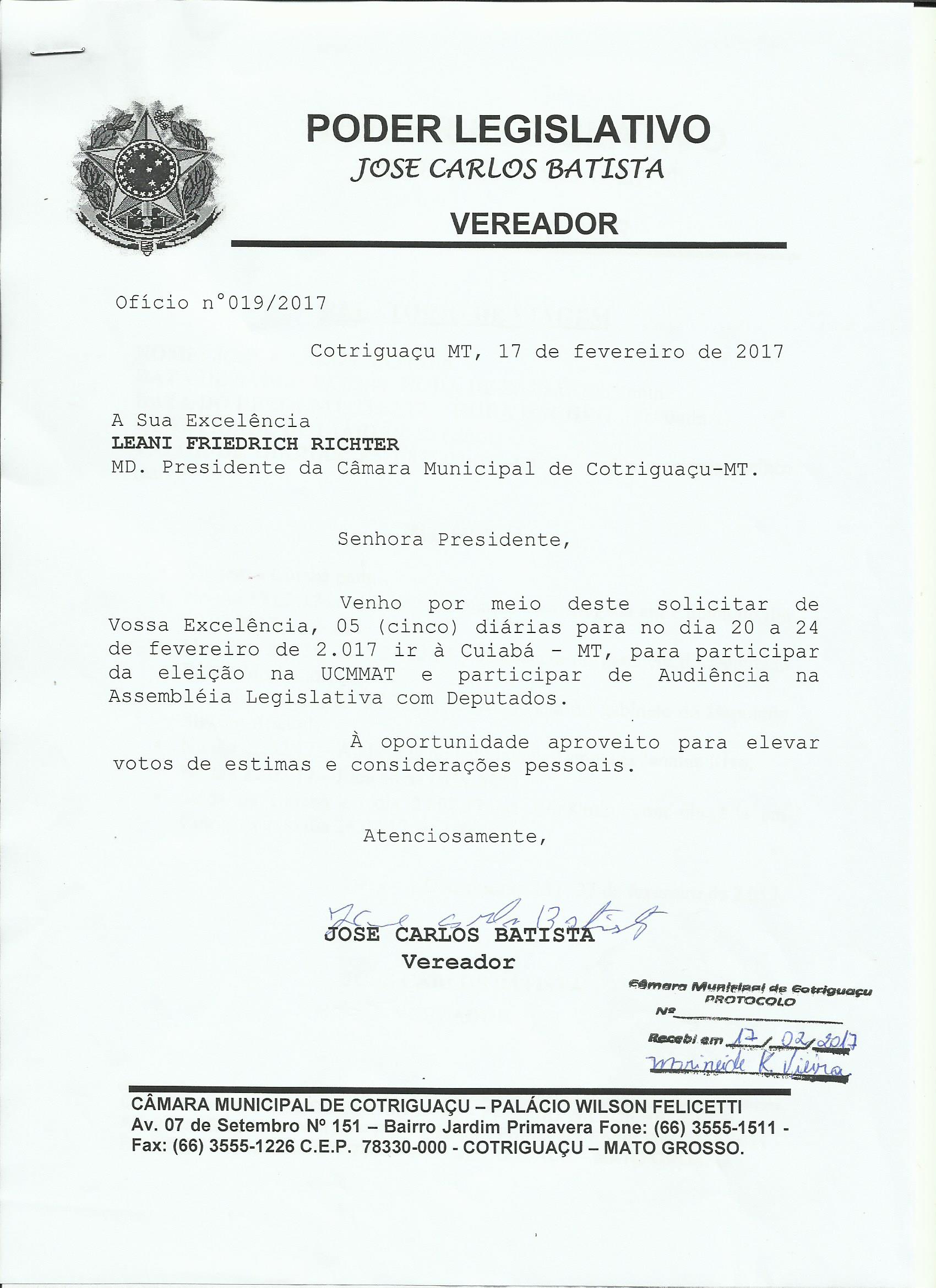 Assunto: CINCO DIÁRIAS A CUIABÁ AO VEREADOR JOSE CARLOS BATISTA PARA PARTICIPAR DE AUDIENCIA COM DEPUTADOS EM CUIABÁ E ELEIÇÃO NA UCMMAT
