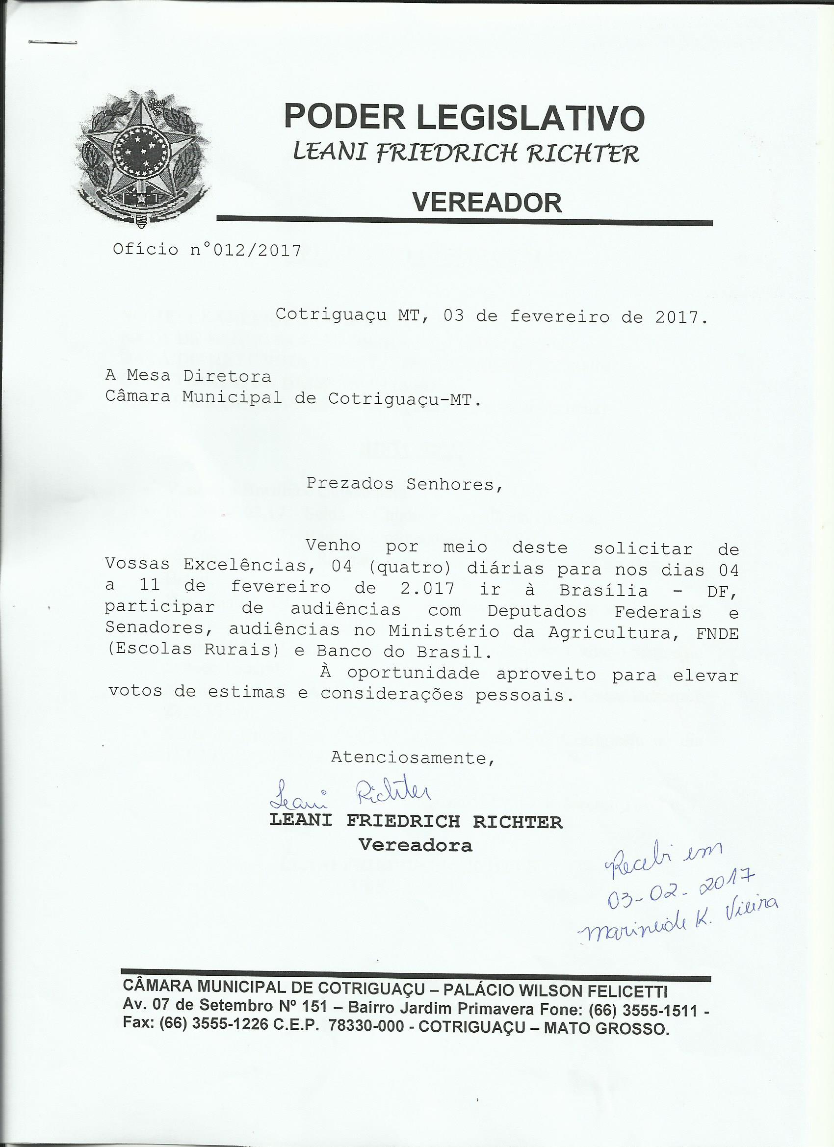 Assunto: QUATRO DIÁRIAS A BRASILIA A PRESIDENTE DA CÂMARA LEANI RICHTER PARA REUNIÃO E PROTOCOLO DE DOCUMENTOS NO FNDE, BANCO DO BRASIL, AUDIÊNCIA COM DEPUTADO FEDERAL ADILTON SACHETI, SENADOR CIDINHO SANTOS E DEPUTADOS OSCAR BEZERRA E ZECA VIANA